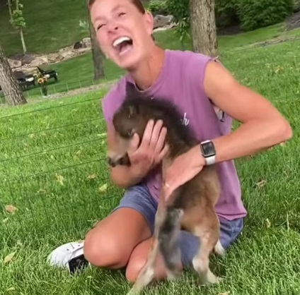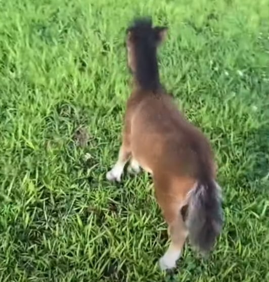 The video shows Teddy bouncing around Stacy, eagerly seeking attention. He may be a tiny horse, but with his playful energy, he sure acts like a puppy.
