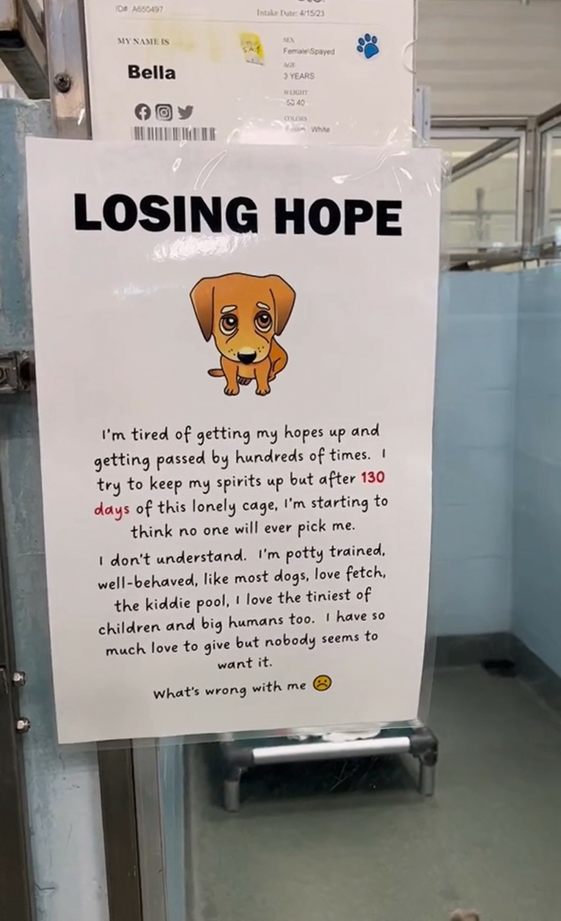 The shelter decided to do something different. They created a message written from Bella’s perspective, placing it on her kennel so visitors could understand what she might be feeling.
