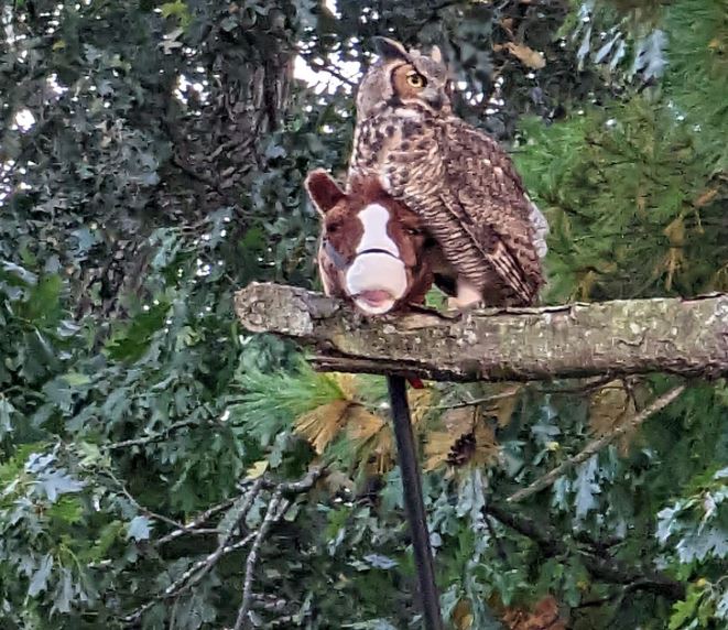 "Current situation at my parents house…..the young neighborhood owl has stolen this stick horse and is flying around the neighborhood with it. Hilldale/Forest Park/Ridge lane neighbors…if your child is missing their stick horse, you'll have to talk to the owl!!"