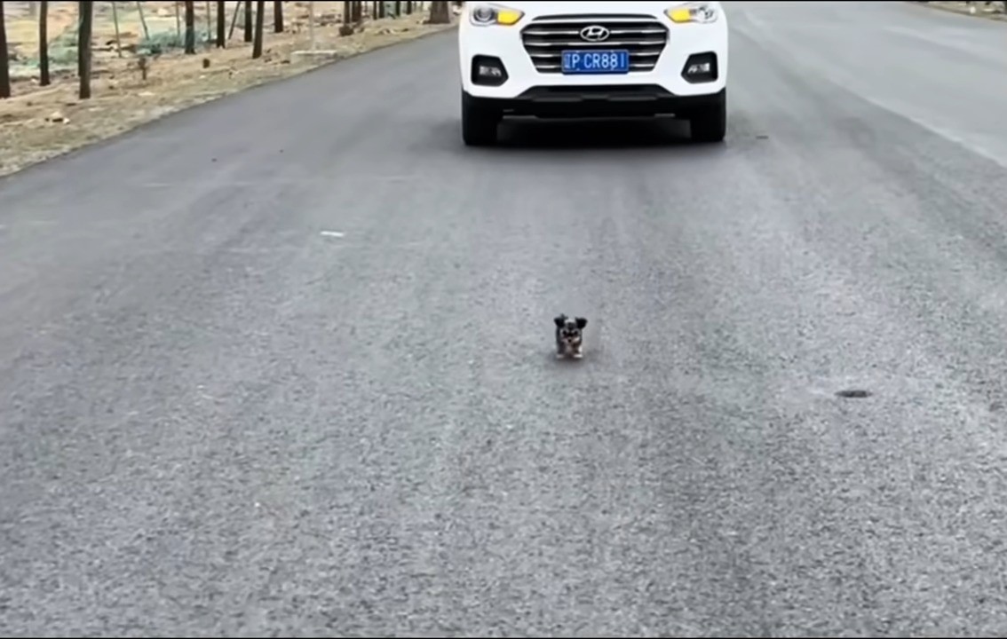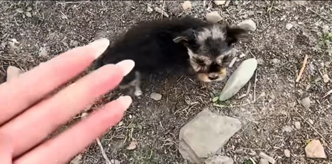 When the rescuers pulled over, they saw the tiny puppy walking straight towards them, clearly seeking help.